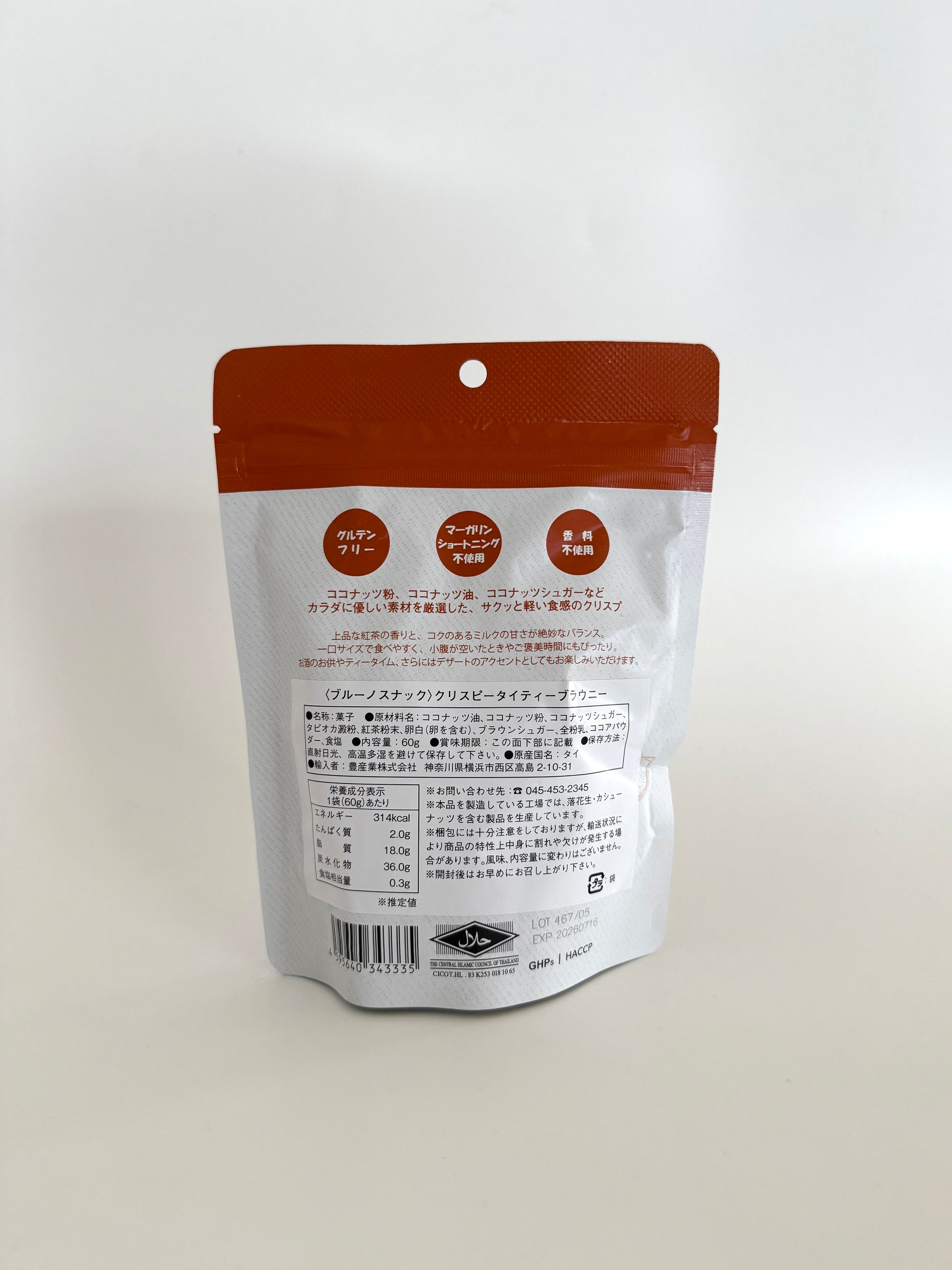 グルテンフリーで小麦の代わりにココナッツを使用したサクッと軽い食感のクリスプ。上品な紅茶の香りと、コクのあるミルクの甘さが絶妙なバランス。 マーガリン・白砂糖・香料・着色料・保存料は一切使用しておらず、素材本来の風味をお楽しみいただけます。 ひと口サイズで食べやすく、小腹がすいたときやご褒美タイムにぴったり。お酒のお供やティータイム、デザートのアクセントとしても幅広くご利用いただけます。