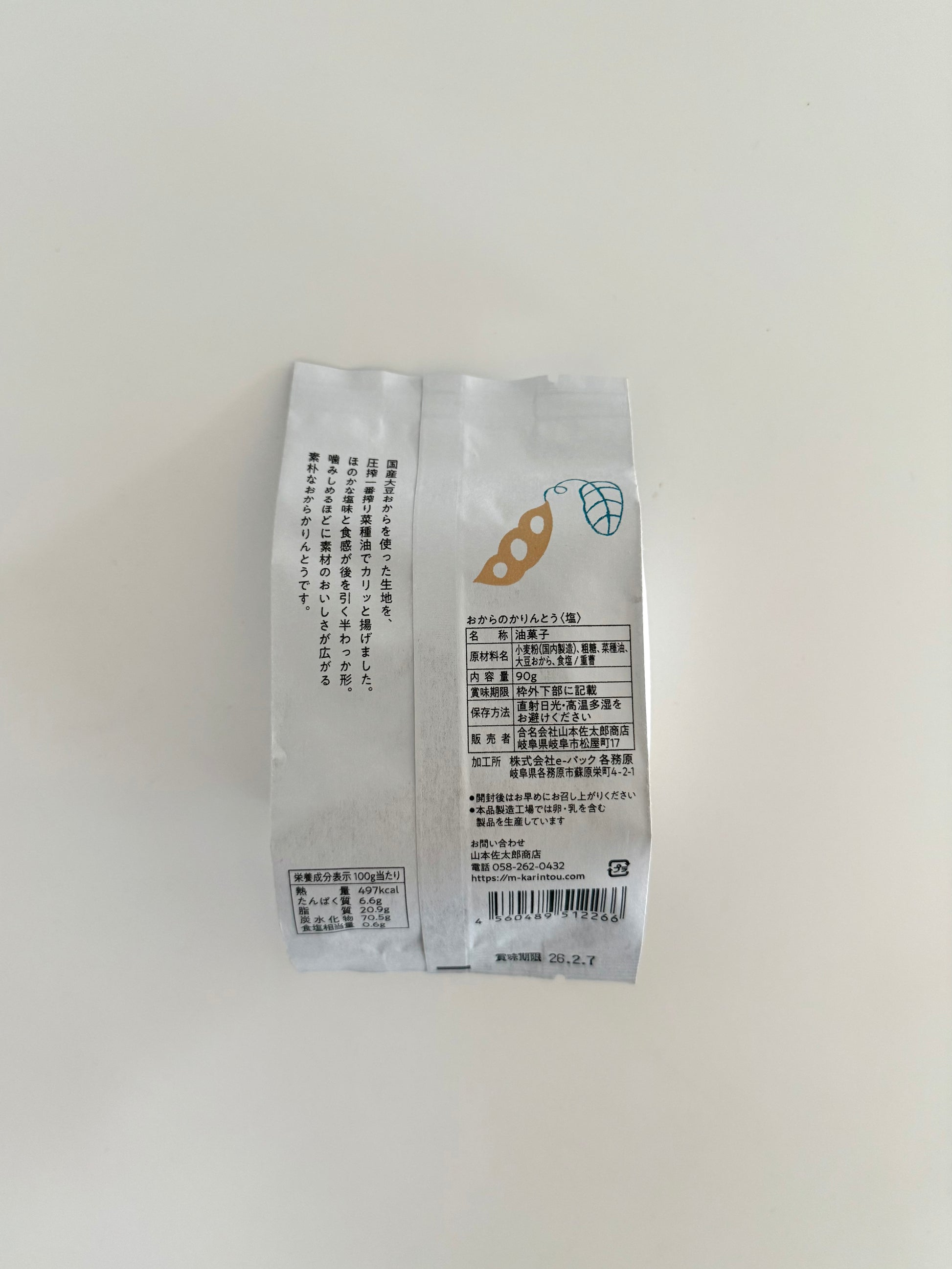 - 愛知県産小麦粉、鹿児島県産粗糖、圧搾一番搾り菜種油、国産大豆おから、天日塩使用海「はいのち」、重曹
